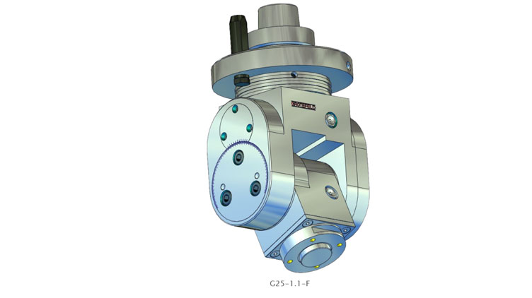G25系列的角頭具有可根據刻度進行無級調整的加工主軸。設置范圍從 0°(垂直)擴展到兩側最大 100°。主軸的旋轉方向與驅動器的旋轉方向相反。